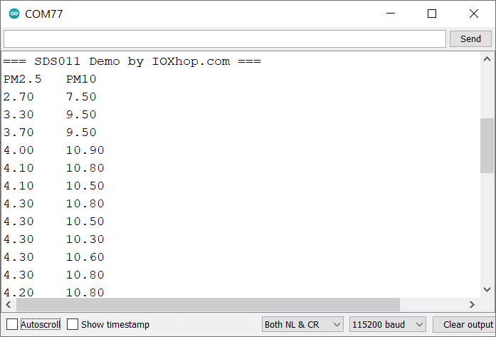 เปิด Serial Monitor ขึ้นมา จะเห็นว่ามีค่าฝุ่น PM2.5 และ PM10 ที่เซ็นเซอรฺ์วัดได้ แสดงออกมาแล้ว