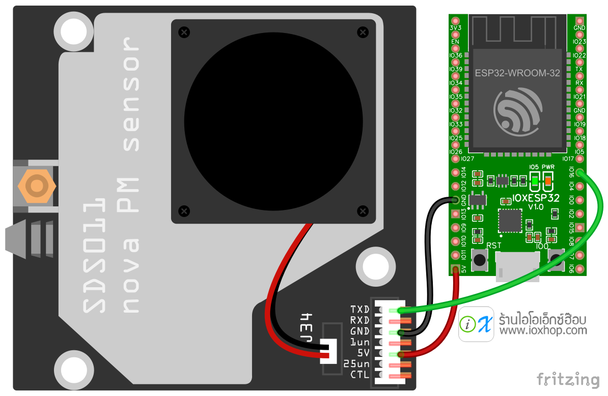 หมายเหตุ. ต้องรันโปรแกรมในโหมด Admin โปรแกรมจึงจะมองเห็นพอร์ตและเชื่อมต่อกับตัวเซ็นเซอร์ได้ การใช้งานกับ ESP32 ต่อโมดูล SDS011 เข้ากับบอร์ด ESP32 ดังนี้