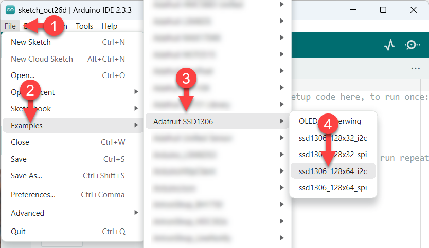 เปิดโค้ดโปรแกรมตัวอย่างโดยกดที่ File > Examples > Adafruit SSD1306 เลือก ssd1306_128x64_i2c