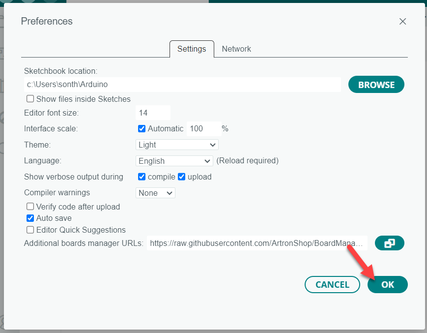 2) กดปุ่มด้านหลังหัวข้อ Additional boards manager URLs: