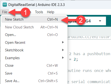 ที่โปรแกรม Arduino IDE ให้สร้างไฟล์ใหม่ขึ้นมา โดยกด File > New Sketch