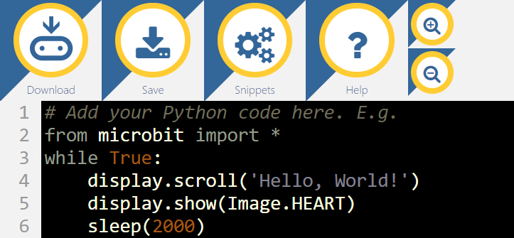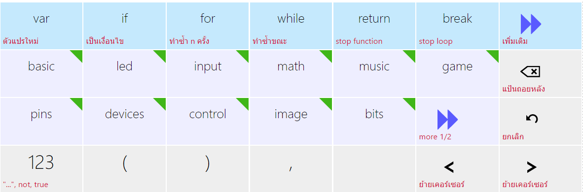 เหมาะสำหรับหน้าจอสัมผัส โดยจะใช้วิธีแตะบนปุ่มแล้วระบบจะเขียนโค้ดลงมาเป็นบรรทัด แต่วิธีใช้ค่อนข้างงงมากต้องดำน้ำกันเยอะพอตัว ส่วนตัวแล้วผมไม่แนะนำให้ใช้เจ้านี่ ควรใช้ Microsoft Block Editor หรือถ้าขั้นสูงแล้วก็ใช้ MicroPython ไปเลยจะดีกว่า