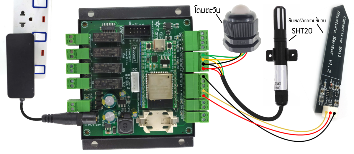 การใช้งานร่วมกับ Farm1กรณีใช้ร่วมกับ Farm1 กล่องควบคุมฟาร์มอัจฉริยะ ต่อวงจรดังนี้ หลังจากต่อวงจรแล้ว ให้ทำตามคู่มือของ Farm1 เพื่อเพิ่มอุปกรณ์ลง HandySense ดูค่าเซ็นเซอร์ได้เลย การใช้งานร่วมกับ ATD3.5-S3 Farm1 shieldกรณีใช้ร่วมกับ ATD3.5-S3 Farm1 shield บอร์ดเสริม ATD3.5-S3 ทำระบบฟาร์มอัจฉริยะ ต่อวงจรดังนี้ หลังจากต่อวงจรแล้ว สามารถใช้เฟิร์มแวร์ ATD3.5-S3 HandySense เพื่อเชื่อมต่อ HandySense ได้เลย หรือเขียนโปรแกรมอ่านค่าด้วยไลบรารี่ ArtronShop_BH1750 การใช้งานร่วมกับ ESP32กรณีใช้ร่วมกับบอร์ด ESP32 (IOXESP32) ให้ต่อวงจรดังนี้ การใช้งานร่วมกับบอร์ด Arduinoกรณีใช้ร่วมกับบอร์ด Arduino Uno R3 ให้ต่อวงจรดังนี้ การเขียนโปรแกรมด้วย Arduino IDEเขียนโปรแกรมด้วย Arduino IDE V2 (แนะนำ) ติดตั้งไลบารี่ ArtronShop_BH1750 ตามขั้นตอนดังนี้ กดเมนู Library Manager จากนั้นค้นหา BH1750 เลือกกดปุ่ม INSTALL ไลบารี่ ArtronShop_BH1750 เมื่อติดตั้งเสร็จแล้ว จะมีข้อความ Installed ขึ้นมา เปิดโค้ดตัวอย่าง File > Examples > ArtronShop_BH1750 เลือก BH1750_read กดเมนู Tool แล้วเลือกบอร์ด เลือกพอร์ต