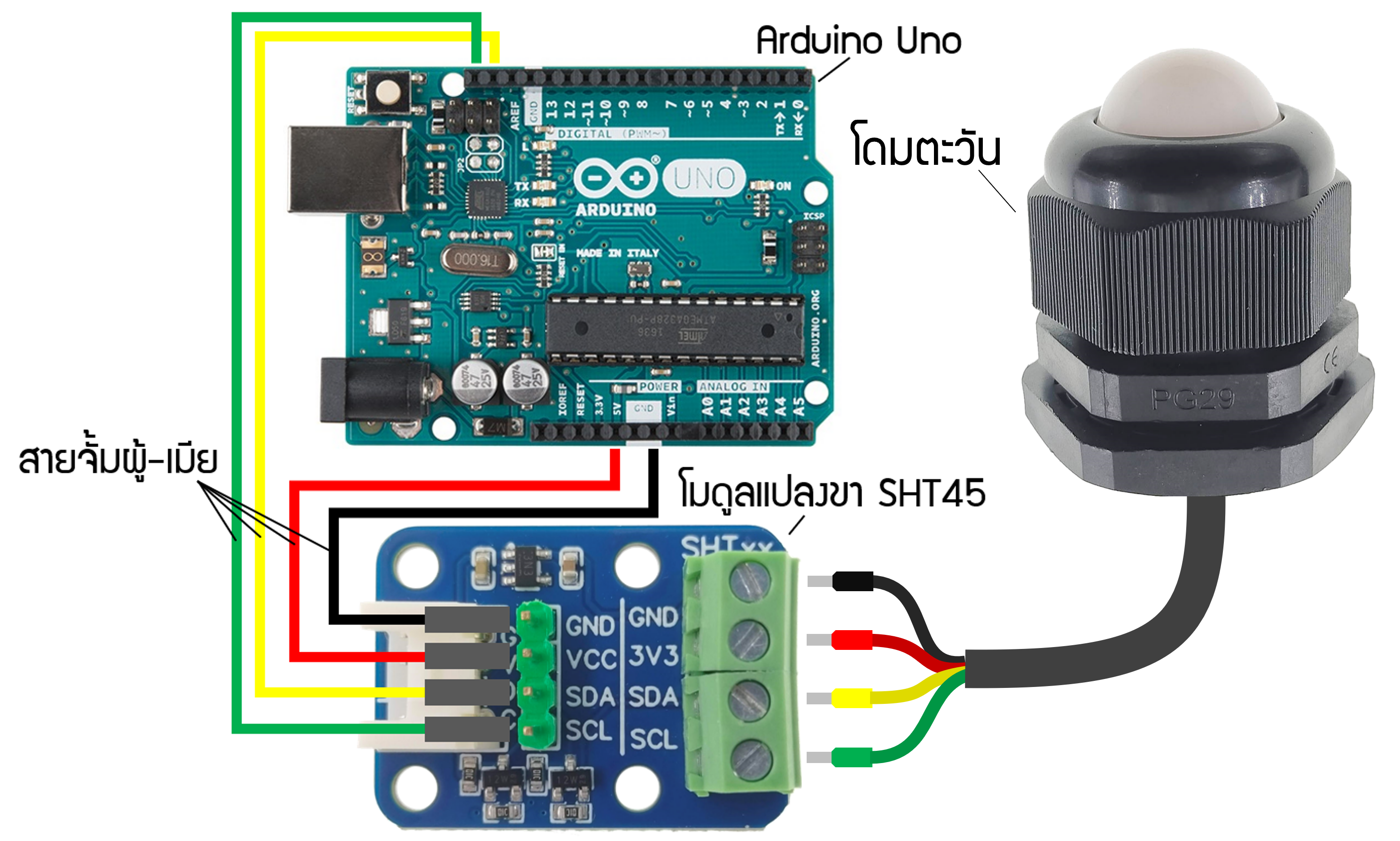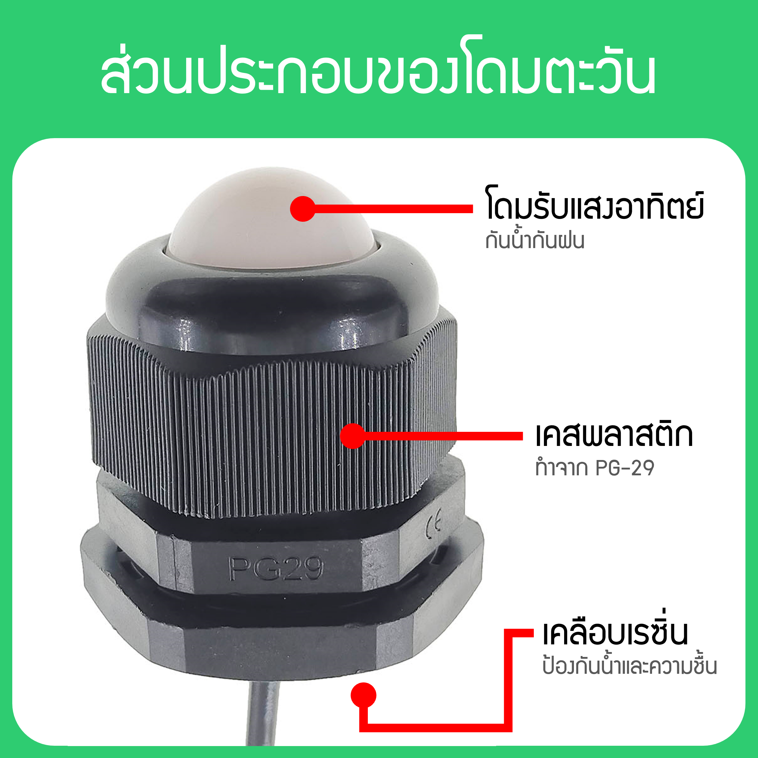 โดมตะวัน เซ็นเซอร์วัดแสงอาทิตย์กันน้ำ I2C BH1750 เป็นชุดเซ็นเซอร์วัดแสง LUX ที่ ArtronShop พัฒนาขึ้นมา เหมาะสำหรับฟาร์มแปลงเล็ก หรือใช้กับ HandySense เช่น Farm1 กล่องควบคุมฟาร์มอัจฉริยะ , ATD3.5-S3 Farm1 shield บอร์ดเสริม ATD3.5-S3 ทำระบบฟาร์มอัจฉริยะ เป็นต้น วัดค่าแสงได้ 0 ถึง 65,535 ลักซ์ ใช้แรงดันไฟฟ้าได้ 3.3V ถึง 5V ใช้กระแสไฟฟ้าในการทำงานเพียง 0.00019A (190 uA) สื่อสารกับไมโครคอนโทรลเลอร์ผ่าน I2C ความเร็วสูงสุด 400 kHz เซ็นเซอร์อยู่ภายใต้โดมพลาสติกที่ช่วยป้องกันน้ำฝนและช่วยกระจายแสงให้เข้าที่หน้าเซ็นเซอร์ผ่านเหมาะสม ประกอบลงใน PG-29 แผงวงจรภายในถูกเคลือบด้วยเรซิ่น ป้องกันความชื้นทำลายแผงวงจรและเซ็นเซอร์