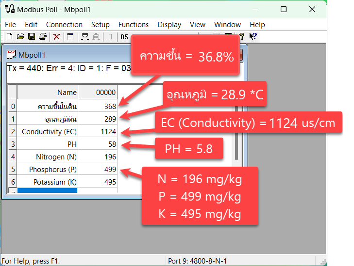 การอ่านข้อมูล Modbus RTUข้อมูลความชื้นในดินอยู่ใน Function Code: 3, Address: 0 (PLC Address: 40001) ข้อมูลชนิด Unsigned อยู่ในรูป x10 เช่น อ่านค่าได้ 203 หมายถึง 20.3% (นำค่าที่อ่านได้หาร 10 เพื่อให้ได้ค่าจริง) ข้อมูลอุณหภูมิอยู่ใน Function Code: 3, Address: 1 (PLC Address: 40002) ข้อมูลชนิด signed อยู่ในรูป x10 เช่น อ่านค่าได้ 246 หมายถึง 24.6 ℃ (นำค่าที่อ่านได้หาร 10 เพื่อให้ได้ค่าจริง) ข้อมูล EC อยู่ใน Function Code: 3, Address: 2 (PLC Address: 40003) ข้อมูลชนิด Unsigned เช่น อ่านค่าได้ 1000 หมายถึง 1000 us/cm (นำค่าที่อ่านได้หาร 10 เพื่อให้ได้ค่าจริง)