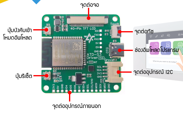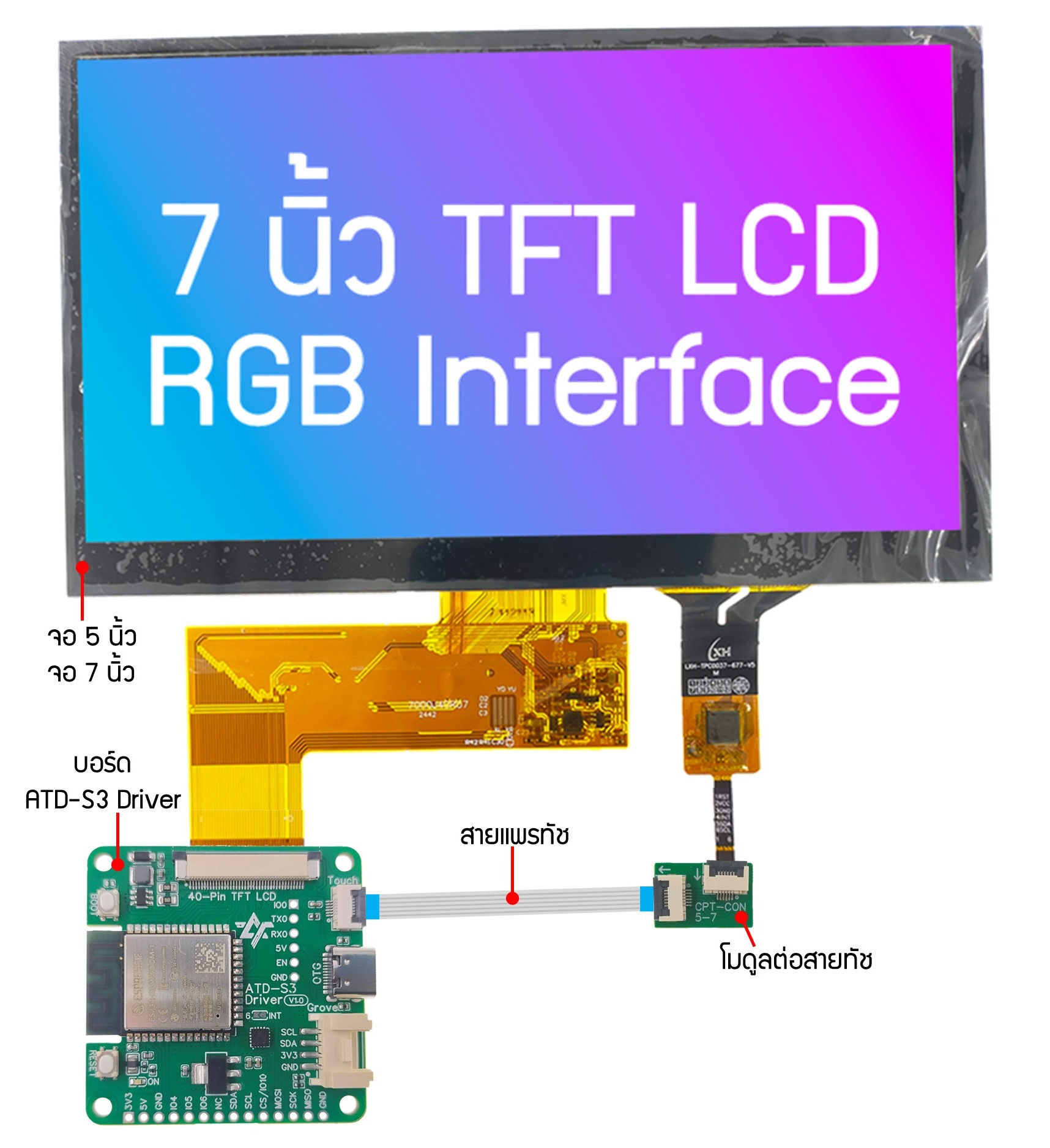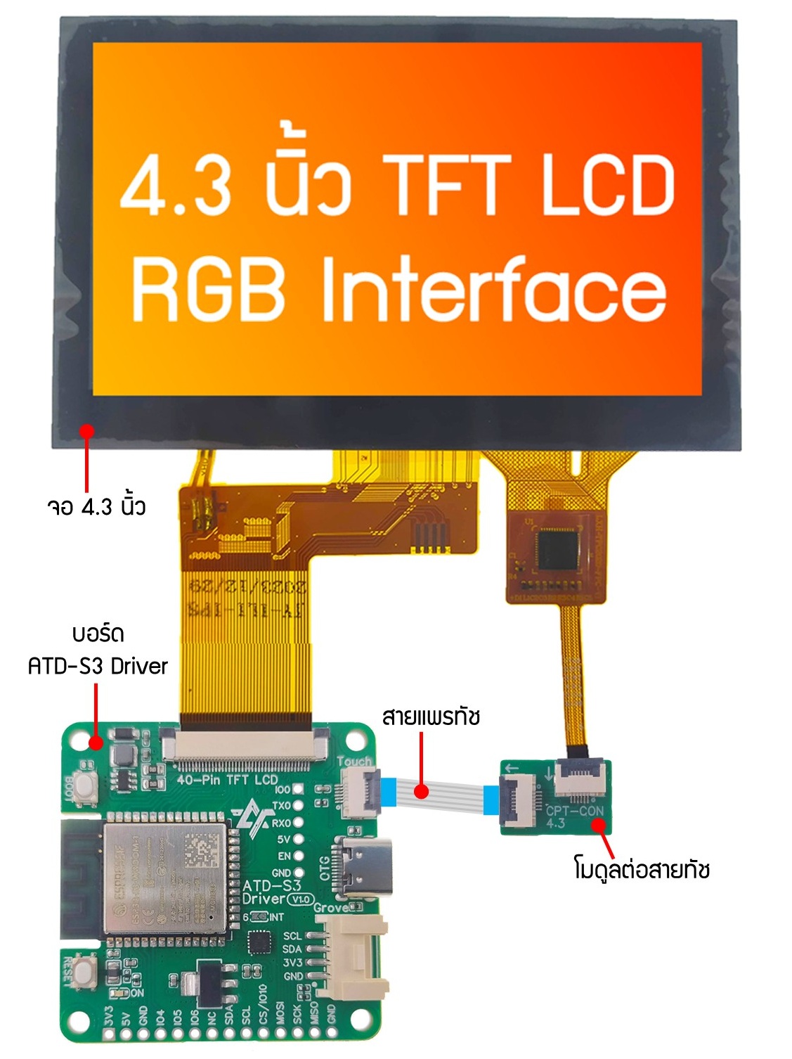 ATD-S3 Driver บอร์ด ESP32-S3 ขับจอทัชสกรีน 4.3/5/7 นิ้ว เหมาะสำหรับงาน HMI นำไปแสดงผลค่าเซ็นเซอร์ ควบคุมเครื่องจักร แสดงสถานะและควบคุมอุปกรณ์ภายในบ้าน (Smart Home) ทำเครื่องกดบัตรคิว เครื่องจ่ายเงิน QR Code และอื่น ๆ ใช้ไมโครคอนโทรลเลอร์ ESP32-S3 รองรับการเชื่อมต่อ WiFi และบลูทูธ 5 (LE) ในตัว พื้นที่เก็บโปรแกรม (Flash) 8MB แรม 512 kB (SRAM) + 8MB (PSRAM) เชื่อมต่อจอผ่าน RGB Interface รูปแบบสี RGB595 รองรับการเชื่อมต่อทัช Capasitive ผ่าน I2C มีจุดต่ออุปกรณ์ภายนอกผ่าน GPIO, I2C (Grove), SPI เขียนโปรแกรมสั่งงานด้วย Arduino IDE, PlatformIO อัพโหลดโปรแกรมผ่านช่อง USB-C หมายเหตุ. แนะนำให้ใช้งานร่วมกับจอที่ทาง อาร์ทรอน ชอป จำหน่าย การเชื่อมต่อกับจอขนาด 4.3 นิ้ว แสดงดังรูป การเชื่อมต่อเข้ากับจอขนาด 5 นิ้ว และ 7 นิ้ว แสดงดังรูป การเขียนโปรแกรมสั่งงานรองรับทั้ง Arduino IDE, PlatformIO มีไลบรารี่ มีโค้ดตัวอย่าง มีคลิปเริ่มต้นใช้งานให้ การออกแบบหน้าจอ รองรับโปรแกรม SquareLine Studio (มีไฟล์โปรเจคตัวอย่างให้) และโปรแกรมอื่น ๆ ที่รองรับ LVGL บนบอร์ดมีสวิตช์รีเซ็ต (RESET) และปุ่มบังคับเข้าโหมดอัพโหลดโปรแกรม (BOOT) มีไฟแสดงสถานะได้รับไฟเลี้ยง การเชื่อมต่ออุปกรณ์ภายนอก รองรับ GPIO จำนวน 3 ช่อง (IO4, IO5, IO6), I2C (Grove), SPI หากต้องการใช้ GPIO เพิ่ม สามารถนำขา CS/IO10, MOSI, SCK, MISO มาเป็นขา GPIO ได้ ใช้งานได้กับอุปกรณ์เสริมของ ATD3.5-S3 เช่น ATD3.5-S3 RS485 shield, ATD3.5-S3 CAN bus shield, ATD3.5-S3 OneCoin shield, ATD3.5-S3 Voice Recognition shield เป็นต้น เคสจอเคสผลิตด้วยเทคโนโลยีเครื่องพิมพ์ 3 มิติ วัสดุ PLA มาพร้อมชุดน็อตยึดติดตั้งเข้ากล่องคอนโทรล แจกไฟล์ 3D ให้พิมพ์เองได้ในหัวข้อเอกสารเพิ่มเติม สินค้าประกอบด้วยตัวเลือก 1 : บอร์ดอย่างเดียว (รหัสสินค้า 03K19)