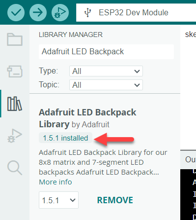 ติดตั้งไลบรารี่ผ่าน Arduino Library Manager เปิดโปรแกรม Arduino IDE กดที่ Libraries Manage ค้นหา Adafruit LED Backpack แล้วคลิก Install
